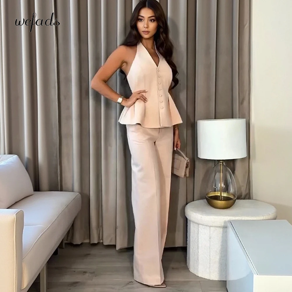 Wefads Women 2 Piece Set Halter Neck Single-Breasted Lotus Leaf Hem Hem Sleeveless Halter Vest Tops+High Waist Wide Leg Pant