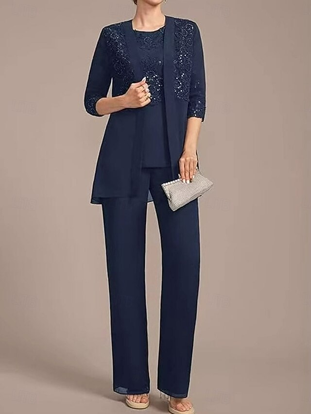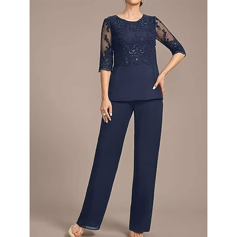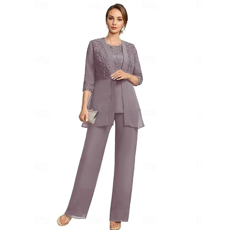 HOT ! 3 Piece Pantsuit Floral Sequin Lace Mother of the Bride Pantsuit Elegant Vintage Crew Neck Ankle Length Half Sleeve with Jacket