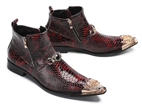 Santimon Men's Red Cowboy Boots - Leather Chelsea Boots for Party, Casual & Rock - Western Ankle Boots with Metal Tip Toe, Bead Accents & Double Zippers 6