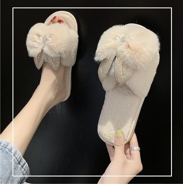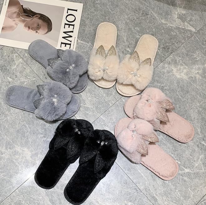 More information about Rabbit Ear Slippers for Woman Bowknot Open Toe Fuzzy Slipper Fuzzy Plush Soft Warm Home Bedroom House Shoes
