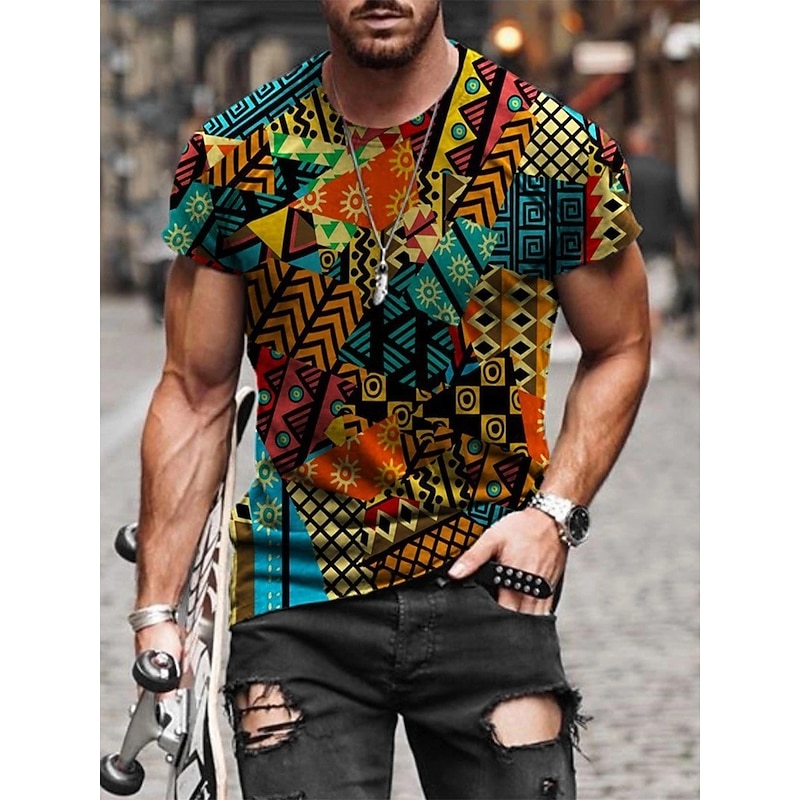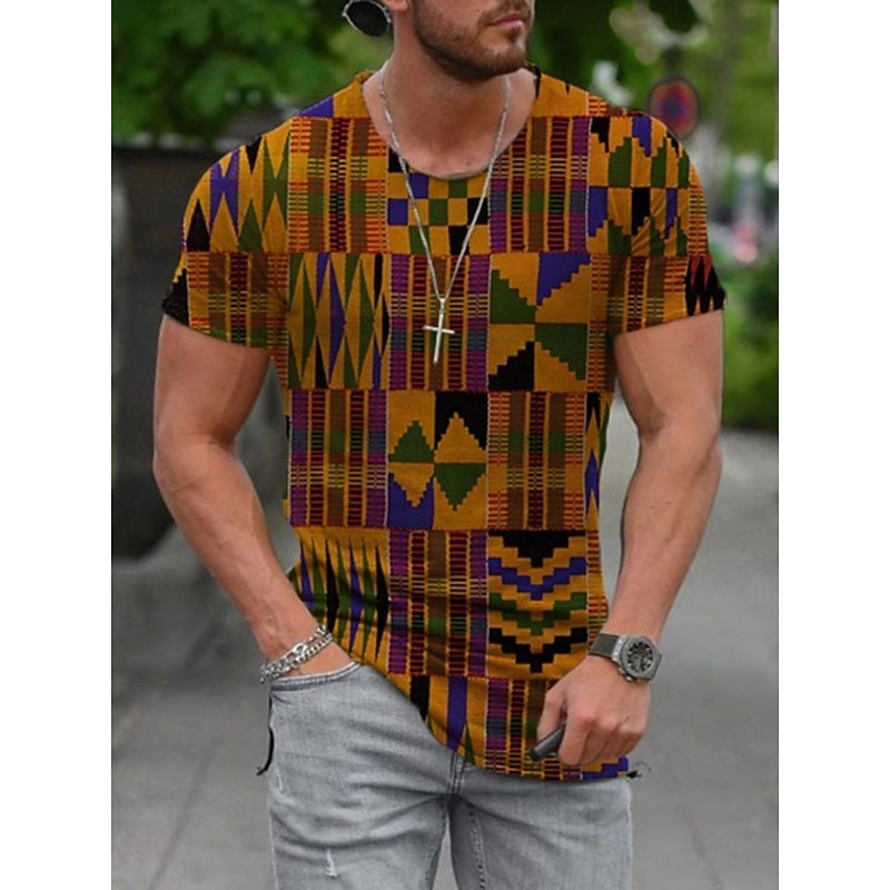 Highlights [Fabric and Comfort] : Crafted from lightweight rayon, this Men's Plus Size Shirt ensures breathability and comfort, making it a perfect choice for spring and summer. The micro-elastic nature of the fabric allows for ease of movement, ideal for casual outings. [Fit and Style] : This t-shirt features a regular fit with a classic round neckline and short sleeves, designed for versatility and comfort. The big and tall sizing options ensure a relaxed fit for a broad range of body types, offering both style and ease. [Design Highlights] : Showcasing a vibrant patchwork of geometric and tribal prints, this shirt exudes a unique, eclectic flair. The earthy tones of brown, red, and yellow blend harmoniously, making it a standout piece for those seeking to express individuality through fashion. [Occasions] : Perfect for casual streetwear and laid-back gatherings, this shirt pairs well with distressed jeans or shorts. Whether for a casual day out or relaxed social events, it adds a bold statement to your wardrobe, ensuring you stay stylishly comfortable. [Size Range] : Available in sizes XL, XXL, 3XL, 4XL, and 5XL, ensuring a perfect fit for all with extended size options. This makes it ideal for those looking for a fit that accommodates larger builds without compromising on style.