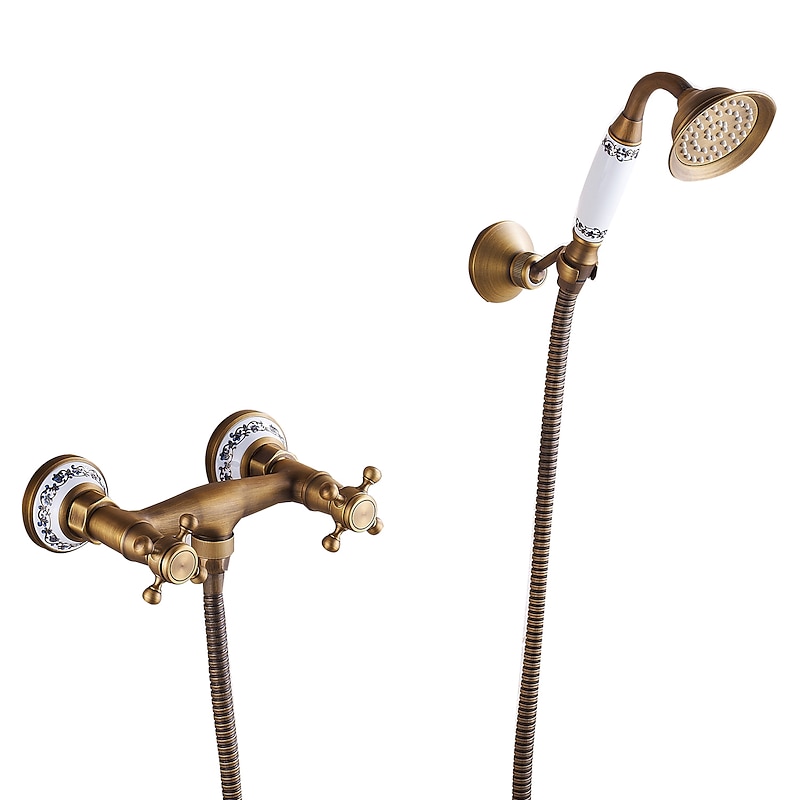 Shower Faucet Set - Handshower Included pullout Vintage Style / Country Antique Brass Mount Outside Ceramic Valve Bath Shower Mixer Taps / Two Handles One Hole 1