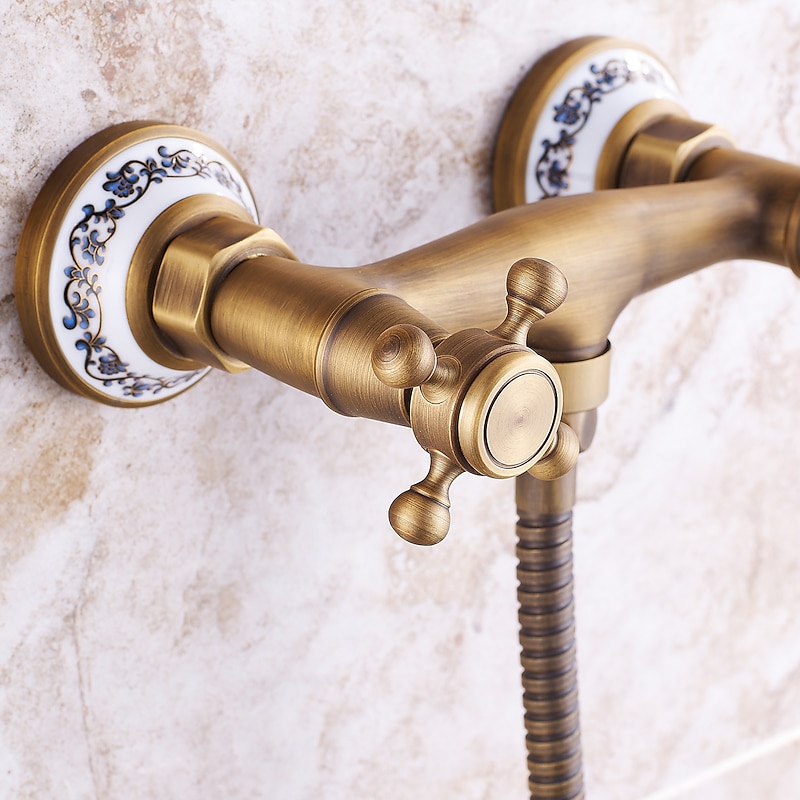 Shower Faucet Set - Handshower Included pullout Vintage Style / Country Antique Brass Mount Outside Ceramic Valve Bath Shower Mixer Taps / Two Handles One Hole 9