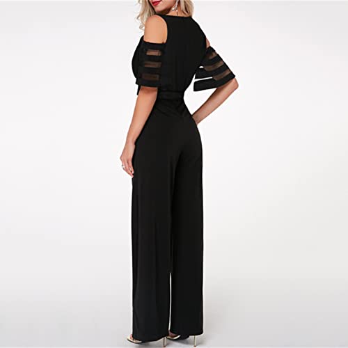 HOT ! HGps8w Women's Cold Shoulder Dressy Jumpsuits Elegant Mesh Sleeve Belted High Waisted Wide Leg Rompers Formal Pantsuits