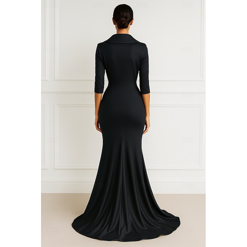Black Tie Mermaid / Trumpet Evening Gown Elegant Dress Formal Wedding Floor Length Half Sleeve Lapel Belt / Sash Stretch Satin with Pleats 1