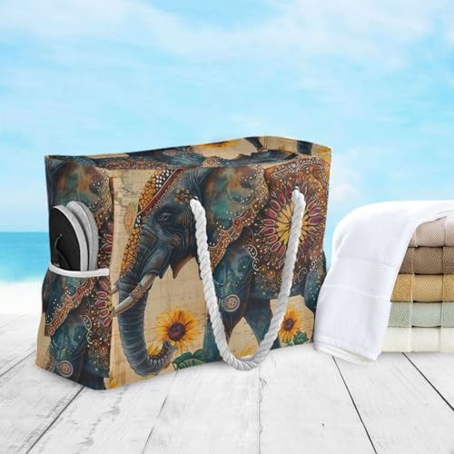 HOT ! Retro Boho Elephant Sunflowers Sandproof Tote Bag Portable with side pocketes Tote Bag Women with cup holders on the side
