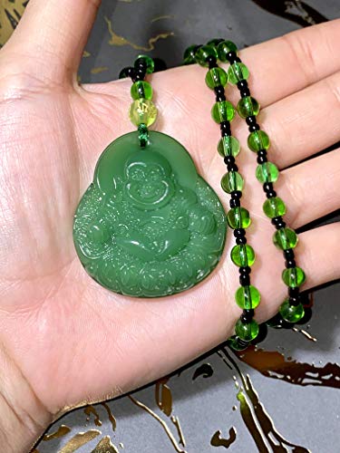 HOT ! Laughing Buddha Green Jade Stabilized Turquoise Pendant 30"Black White Bead Necklace Carved Long Large Boho Chain Genuine Certified Grade A Jadeite Hand Crafted, Jade Medallion