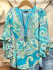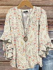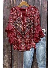 More information about Women's Retro Blouse Layered Ruffle Sleeve Tops Vintage Floral Graphic Bohemia Vintage Daily 3/4 Length Sleeve Regular Tops Daily Holiday Vacation Wear Print Red Blue Beige Summer Spring Fall