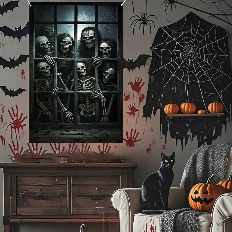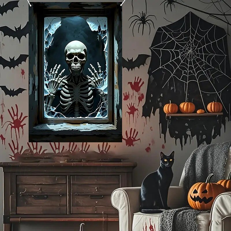 Halloween Window Curtain Skeleton with Outstretched Hands, Creepy Door Cover, Window cover,  Wall Tapestry for 2025 Halloween Haunted House Decoration 2