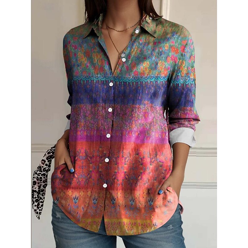 Women's Shirt Button Down Tunic Shirt Collar Long Sleeve Floral Casual Regular Tops Work Daily s Print Pink Red Blue Orange Rainbow Spring Fall 7