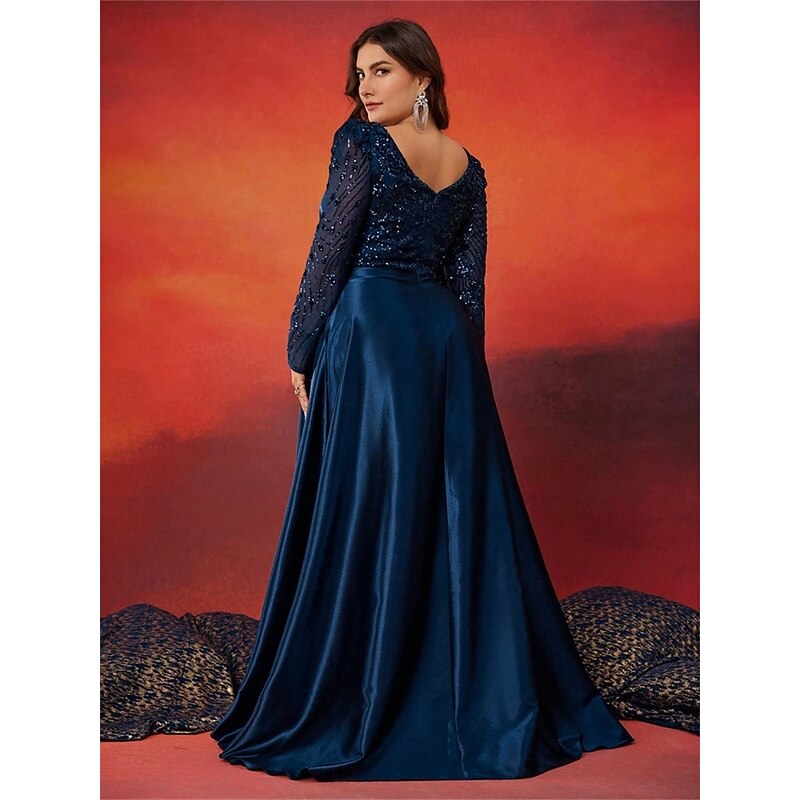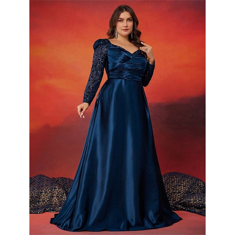HOT ! A-Line Plus Size Dresses Elegant Curve Dress Formal Wedding Floor Length Long Sleeve Sweetheart Satin with Pleats