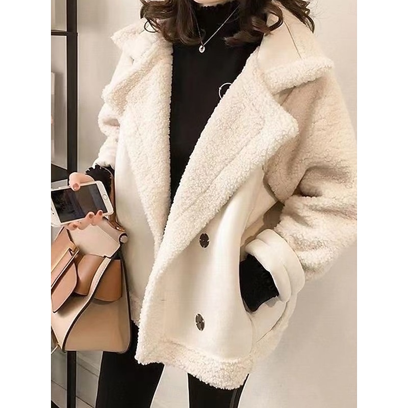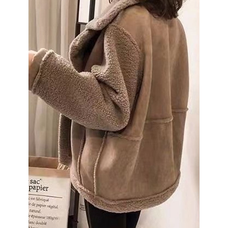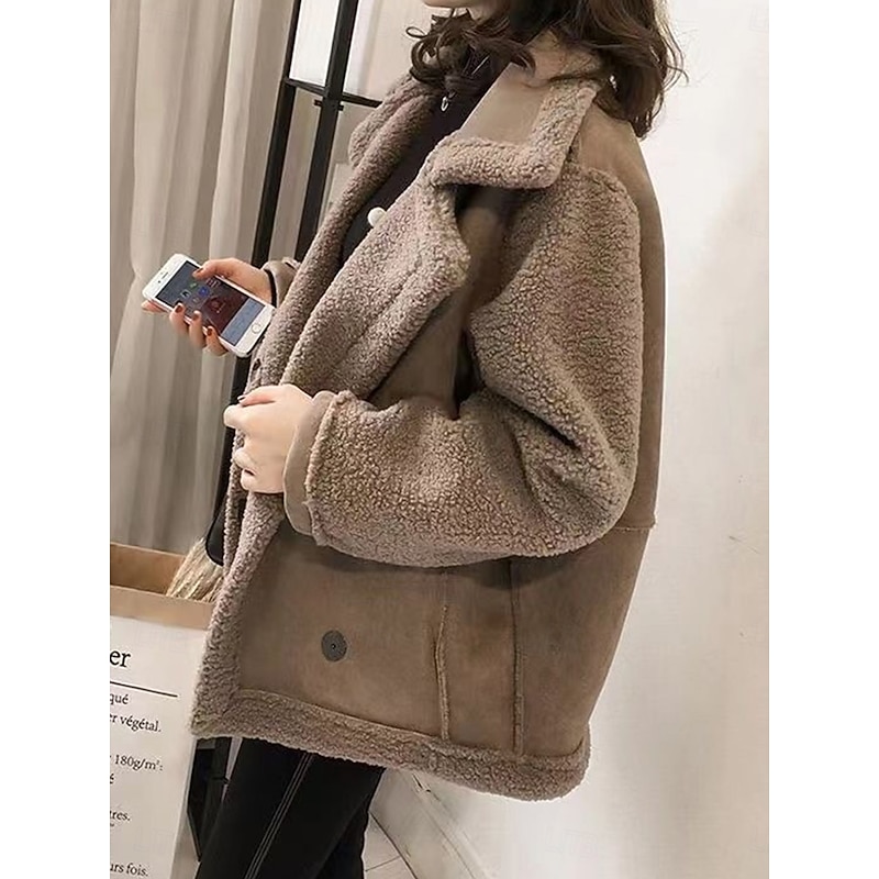 **[Design Highlights]:** The jacket boasts a distinctive turndown neckline with a wide, notched lapel collar, enhancing its relaxed style. The drop shoulders, single-breasted button closure, and matching faux shearling trim on the cuffs and hem lend an elegant touch to its casual aesthetic. Practical elements like the button front and functional pockets add both style and utility.