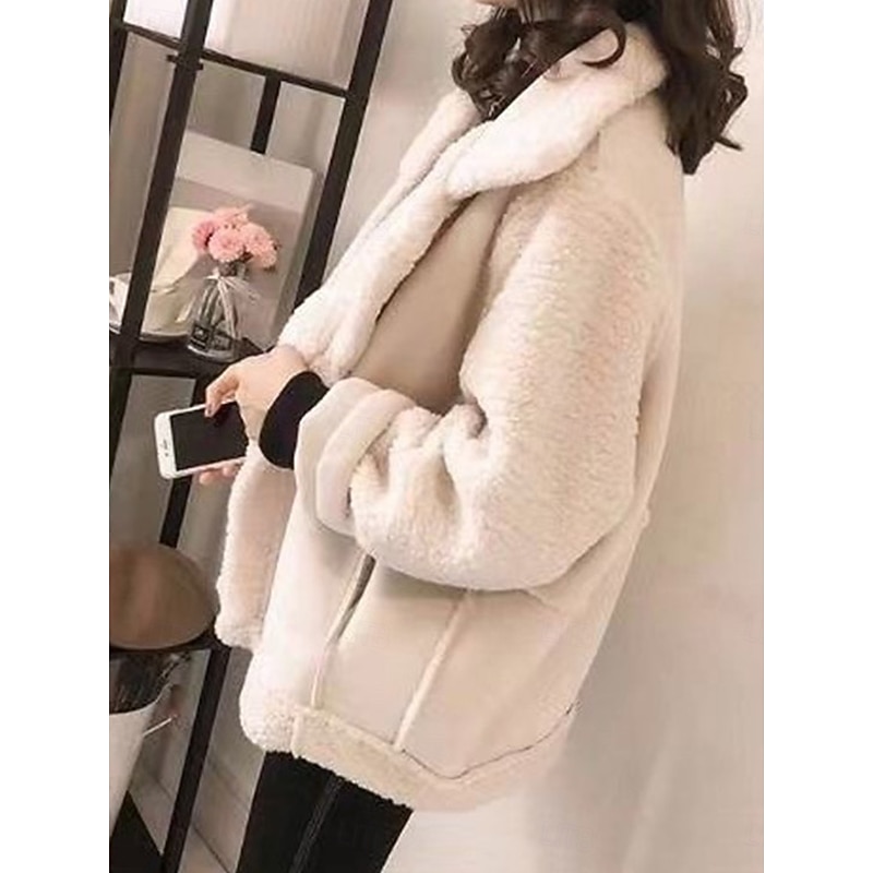 **[Fabric]:** Crafted from high-quality polyester, this jacket features a luxurious faux shearling texture that ensures warmth and comfort during the cold months. The soft, plush exterior and smooth inner lining make it an ideal choice for chilly days.