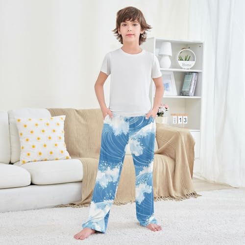 HOT ! Sea Waves Boys Long Pants Soft Trousers Elastic Waist Kids Lounge Bottoms with Pockets S-XL