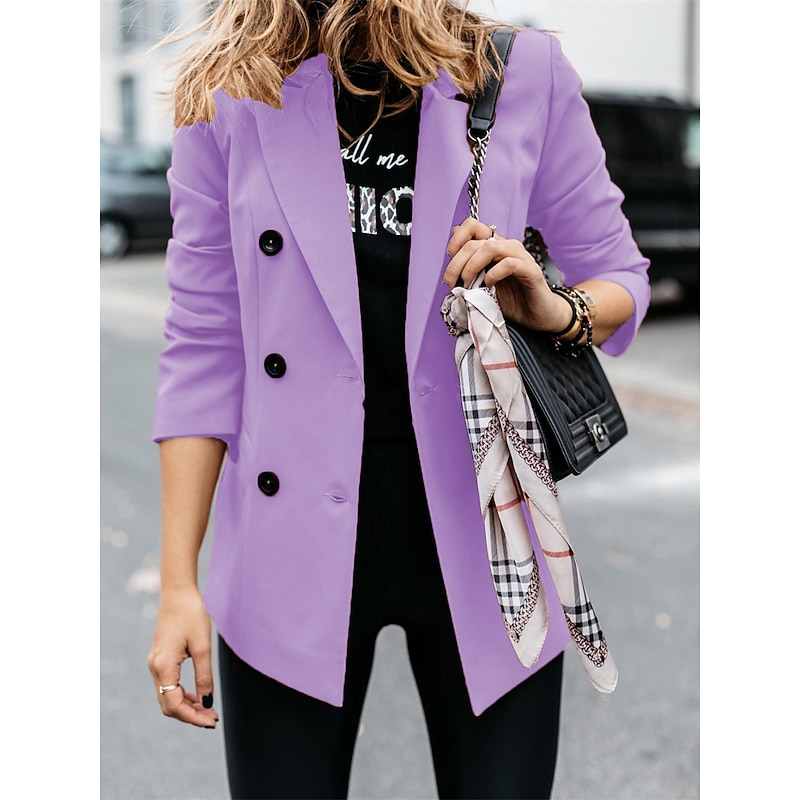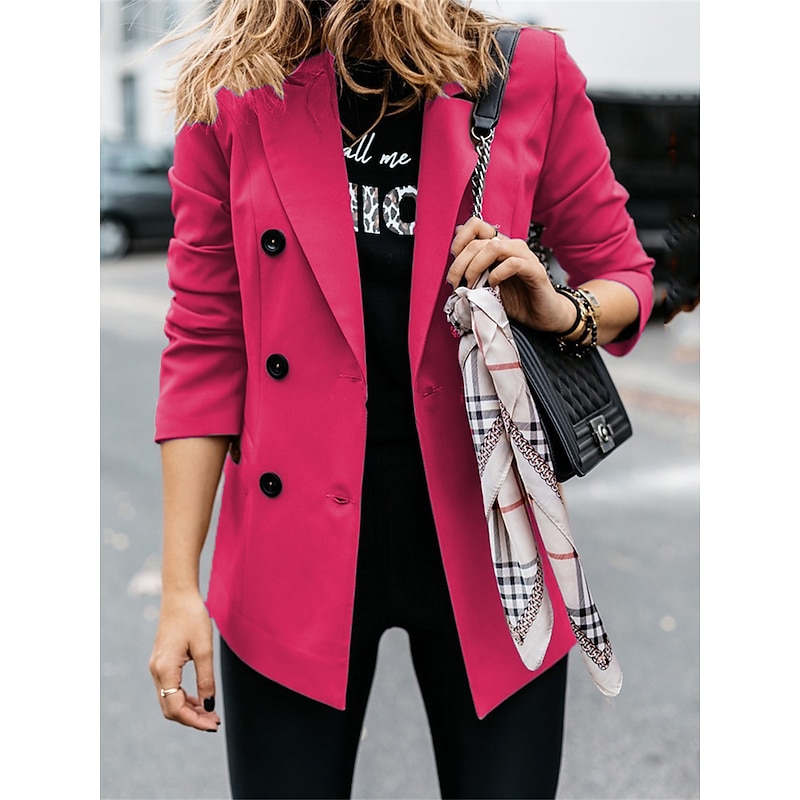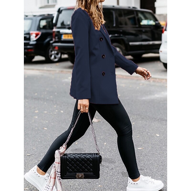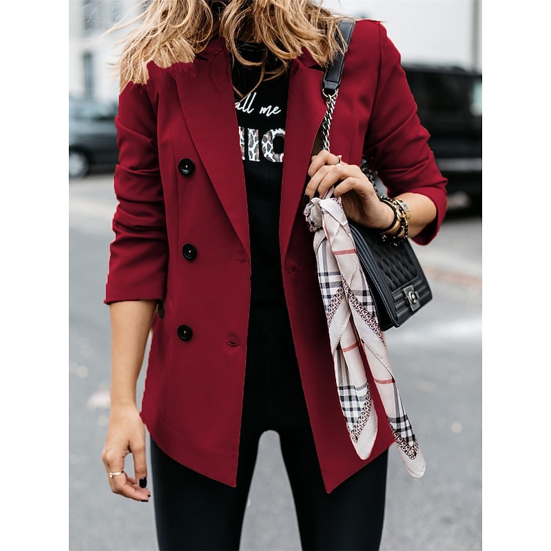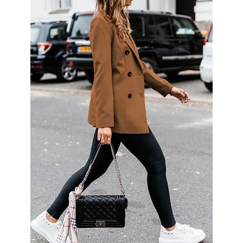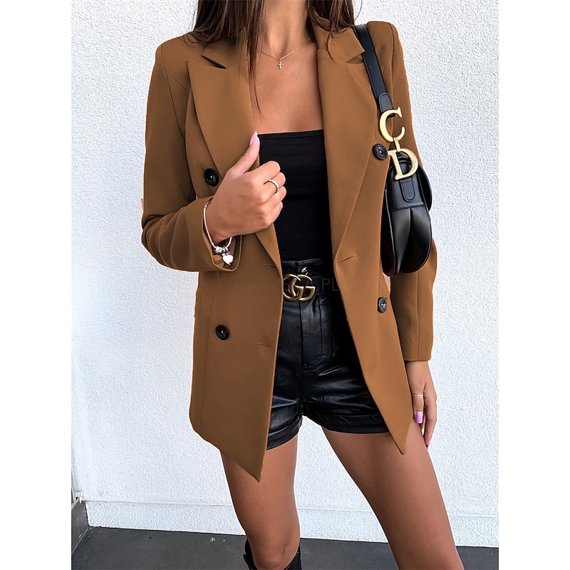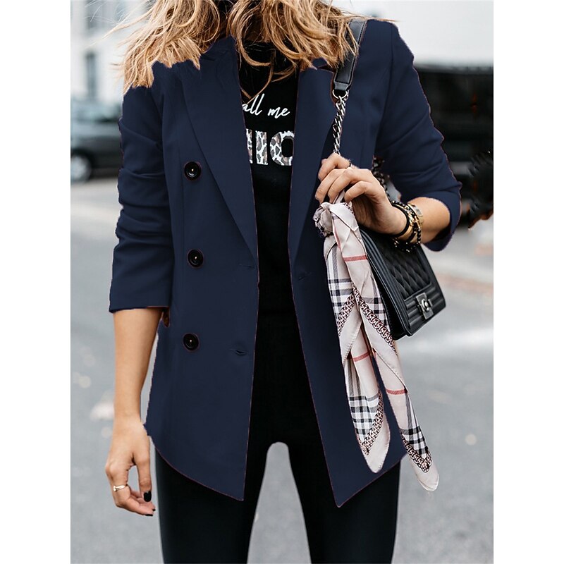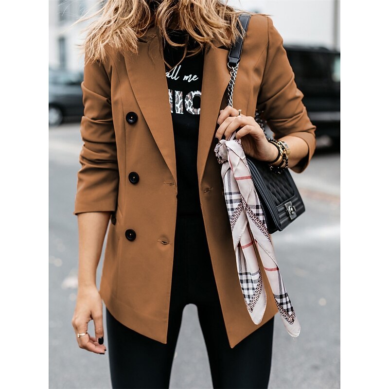 Highlights [Fabric] : Crafted from high-quality polyester, this women's blazer offers a comfortable and micro-elastic fit, ensuring both warmth and breathability throughout the fall and winter seasons. [Fit Type] : This blazer features a regular fit, tailored to provide a structured yet relaxed silhouette that complements various body types. [Design Highlights] : The blazer is designed in a chic double-breasted style with classic lapels and solid color, enhanced by elegant black buttons for a sophisticated contrast. The long sleeves offer a timeless look, making it suitable for both professional and casual settings. [Occasions] : Perfect for a range of settings including going out, work, business meetings, and outdoor activities. Its versatile design allows for effortless pairing with sleek trousers for a formal look or jeans for a more casual flair. [Size Range] : Available in a wide range of sizes from S to 3XL, catering to diverse preferences and ensuring an ideal fit for women looking to make a confident fashion statement.