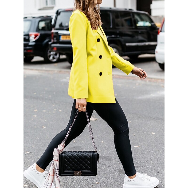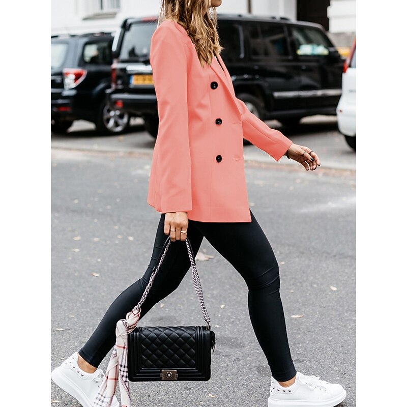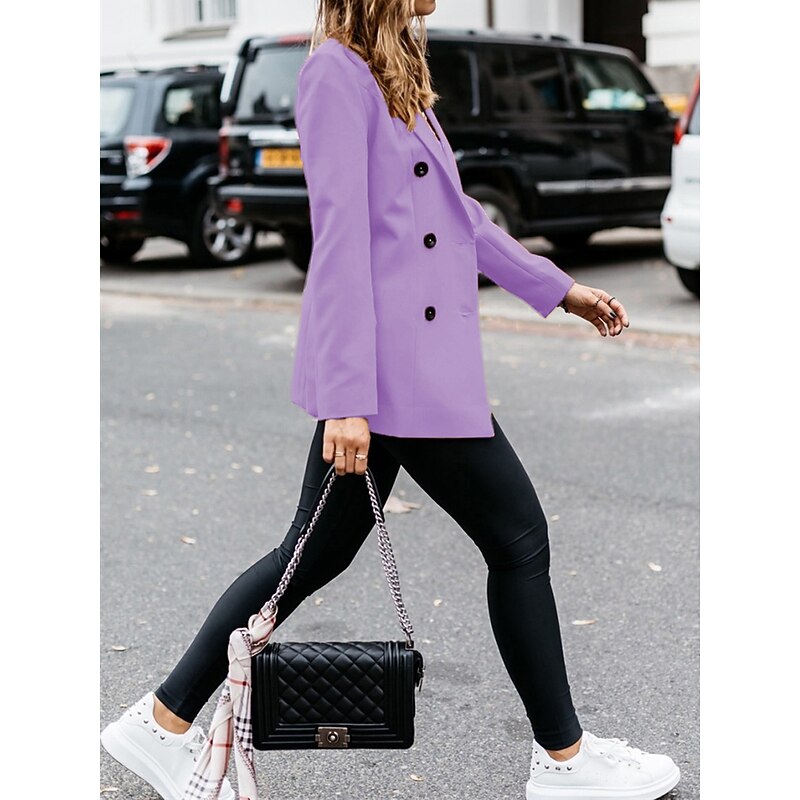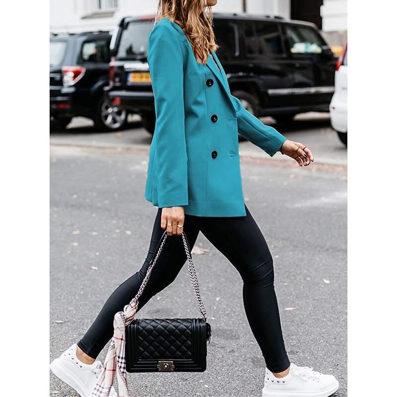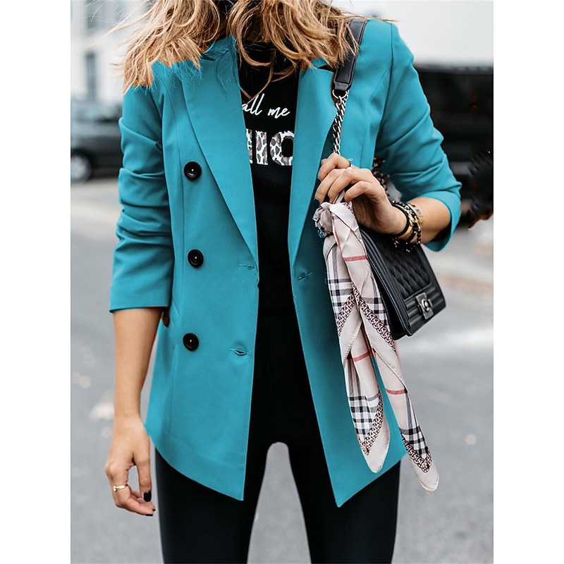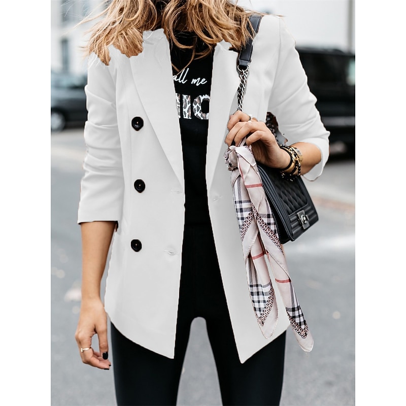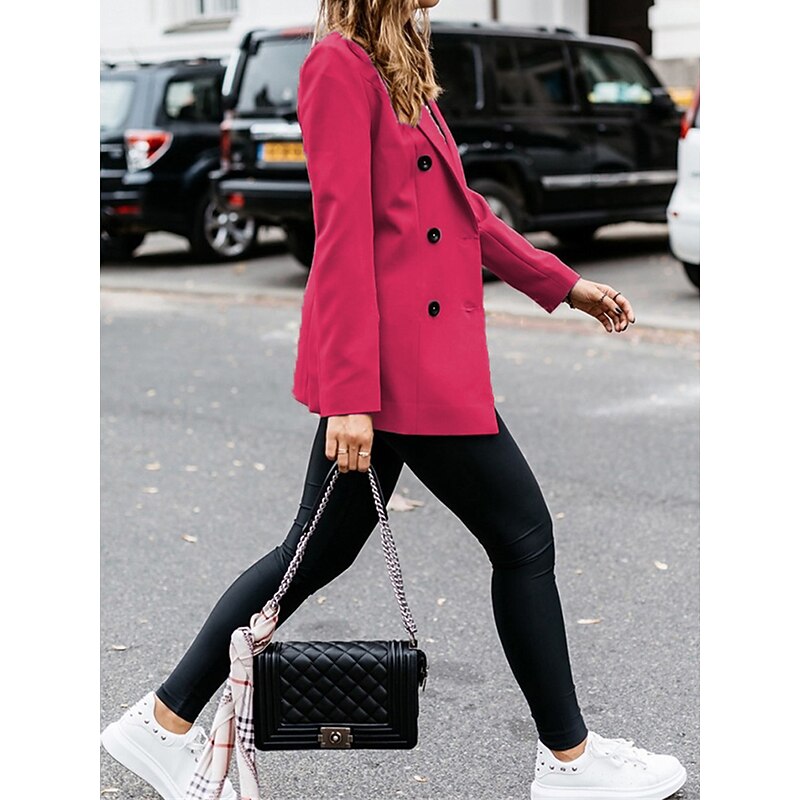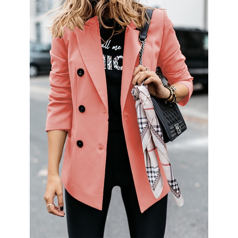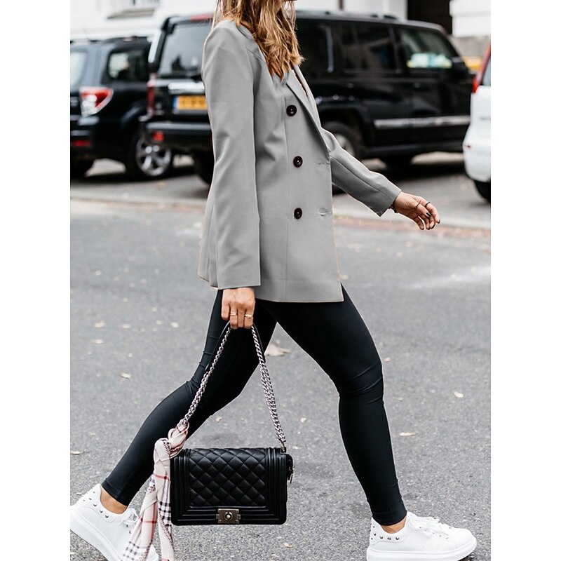 Highlights [Fabric] : Crafted from high-quality polyester, this women's blazer offers a comfortable and micro-elastic fit, ensuring both warmth and breathability throughout the fall and winter seasons. [Fit Type] : This blazer features a regular fit, tailored to provide a structured yet relaxed silhouette that complements various body types. [Design Highlights] : The blazer is designed in a chic double-breasted style with classic lapels and solid color, enhanced by elegant black buttons for a sophisticated contrast. The long sleeves offer a timeless look, making it suitable for both professional and casual settings. [Occasions] : Perfect for a range of settings including going out, work, business meetings, and outdoor activities. Its versatile design allows for effortless pairing with sleek trousers for a formal look or jeans for a more casual flair. [Size Range] : Available in a wide range of sizes from S to 3XL, catering to diverse preferences and ensuring an ideal fit for women looking to make a confident fashion statement.