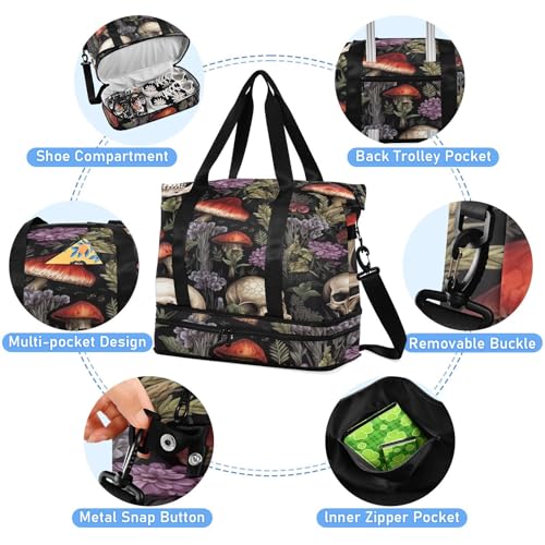 Skull and Mushrooms Duffel Bag Lightweight Carry On Gym Bags for Travel and Weekends, Versatile Overnight Bag with Shoe Compartment 4