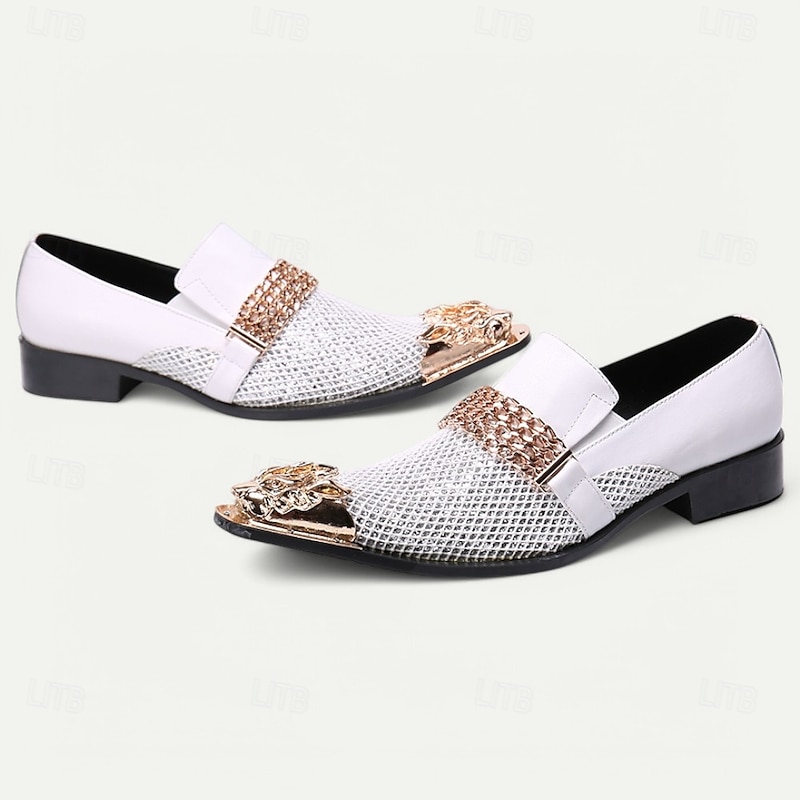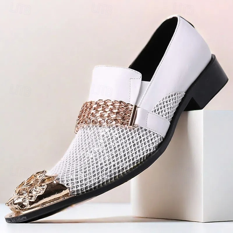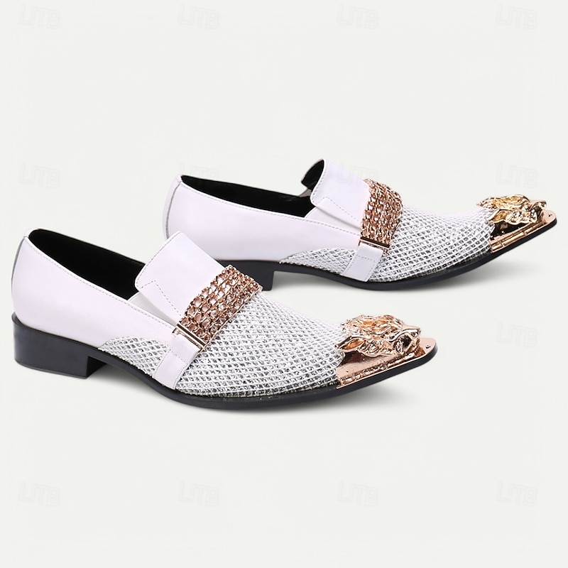 More information about Men's White Premium Cowhide Slip-On Loafers with Metallic Rose Gold Chain and Decorative Toe, Stylish Casual Footwear for Formal and Semi-Formal Occasions