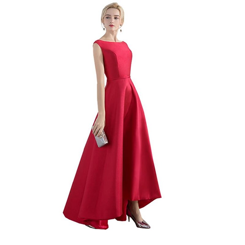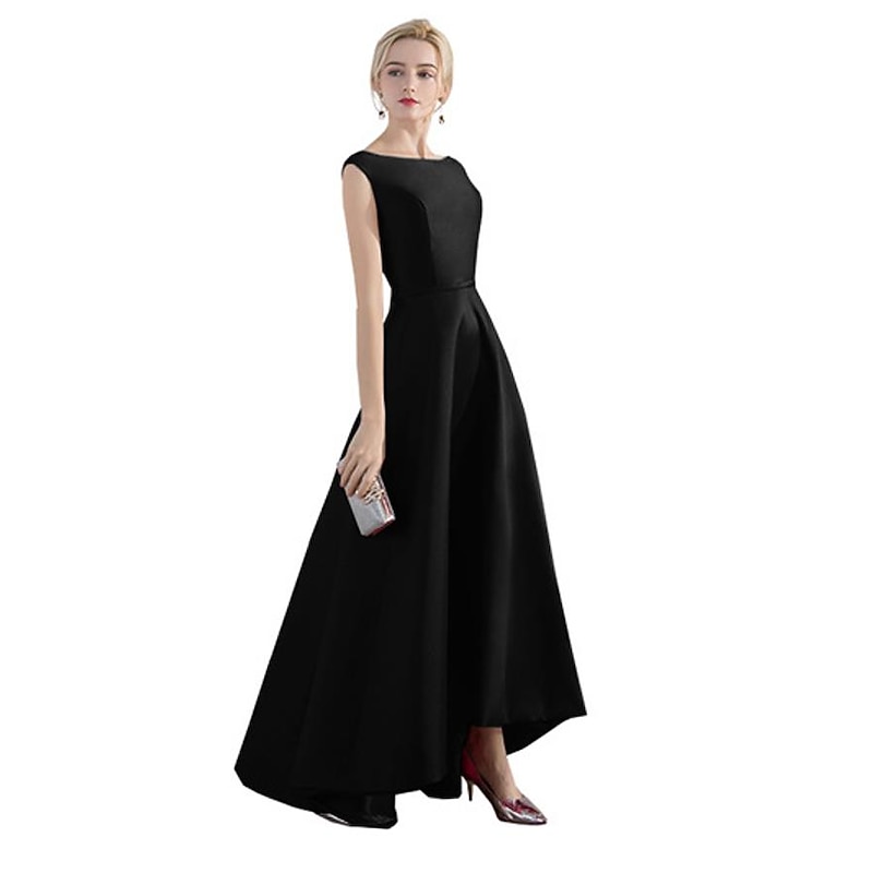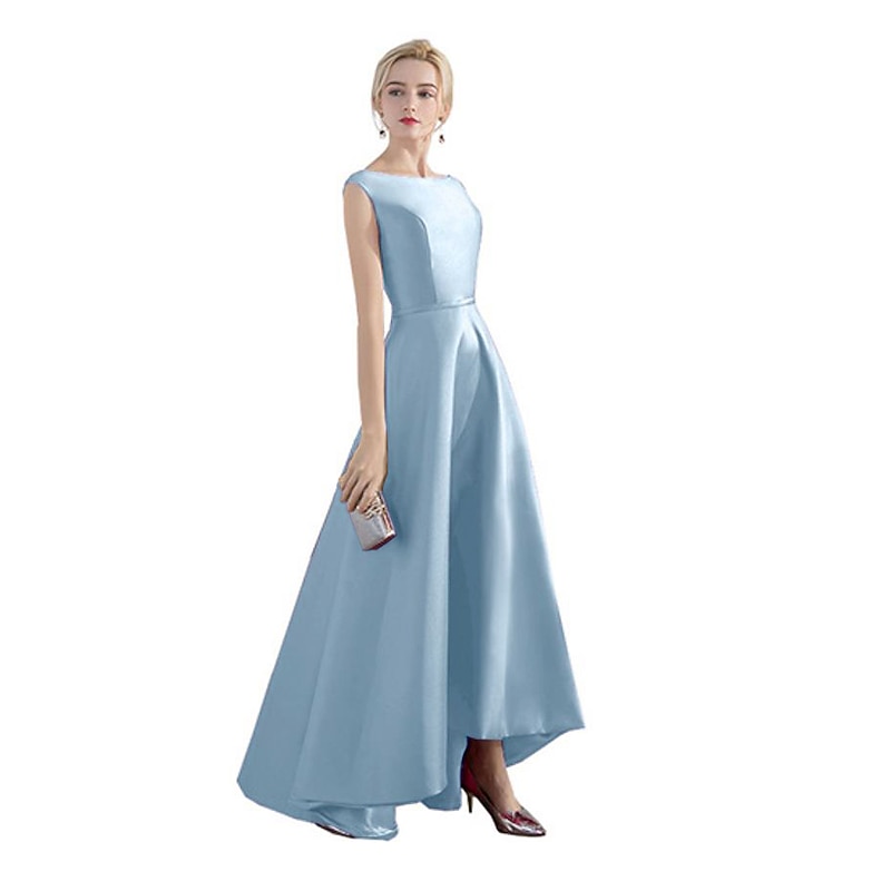 HOT ! A-Line Evening Gown Dress Wedding Guest Party Wear Asymmetrical Sleeveless Jewel Neck Satin with Sleek dress to impress