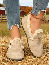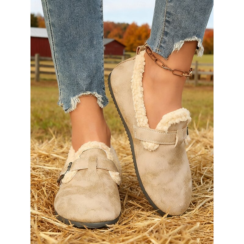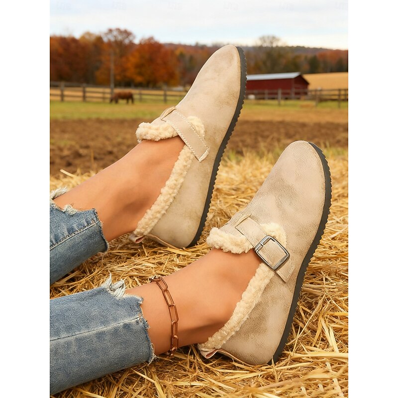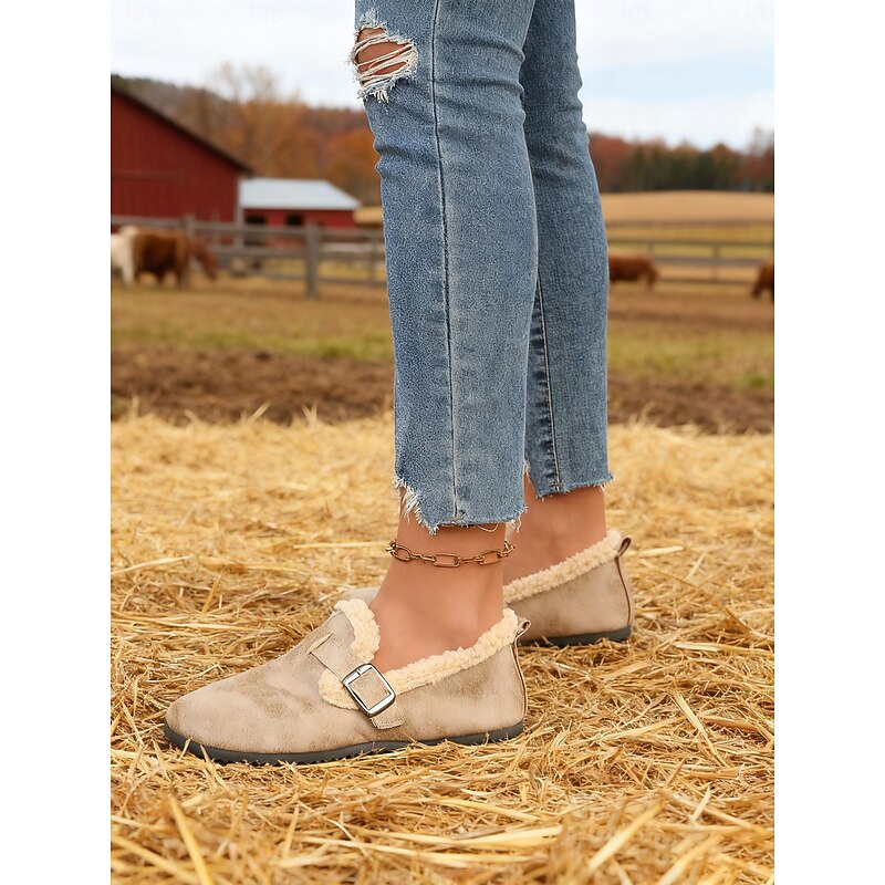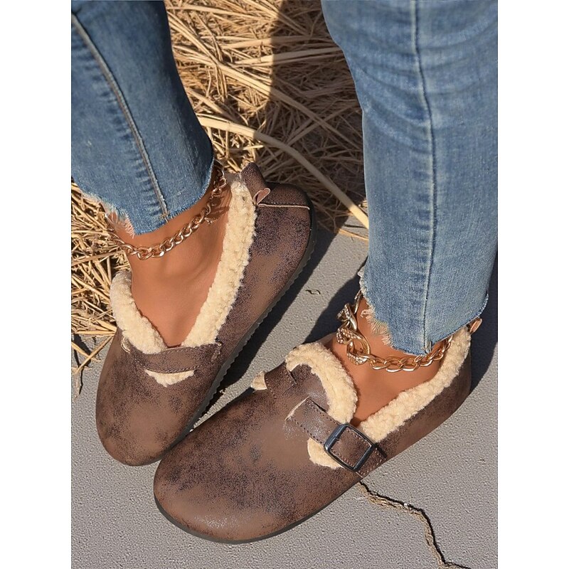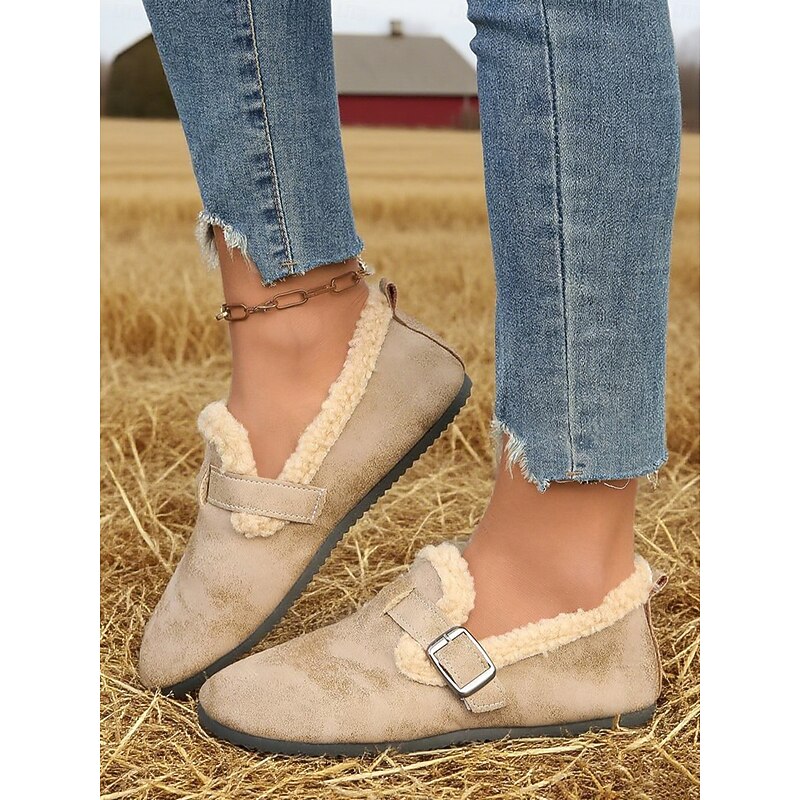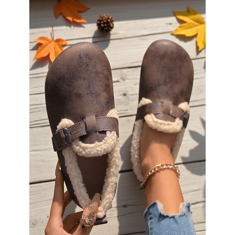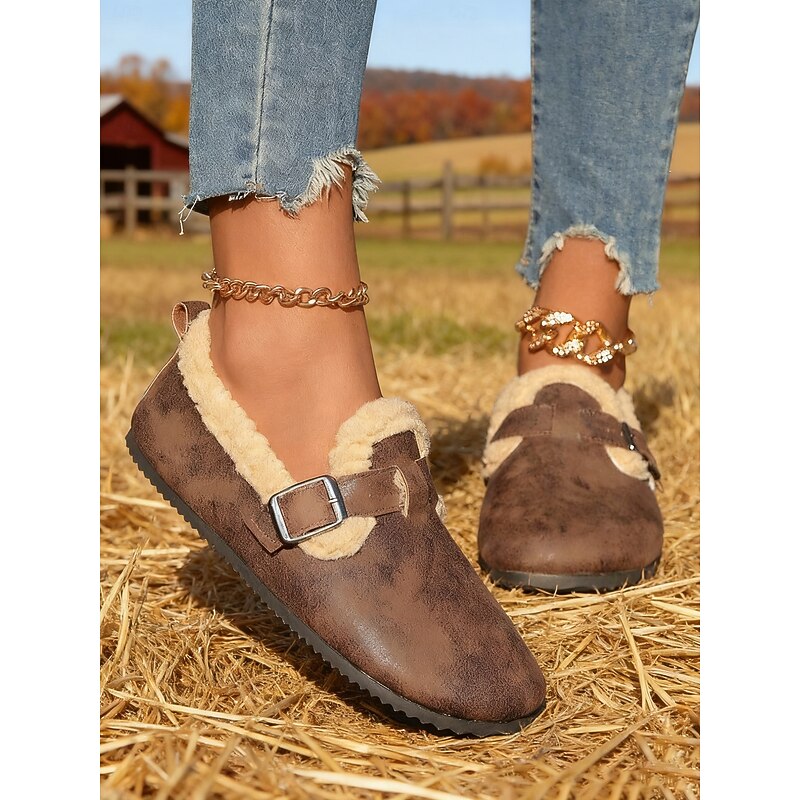 HOT ! Women's Wide Width Brown Fleece Lined Buckle Loafers, Comfortable Warm Casual Shoes for Winter Home or Outdoor