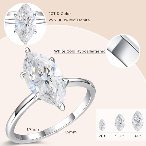 4CT Marquise Cut Moissanite Engagement Ring for Women, D Color VVS1 Clarity 14K Gold/White Gold Plated Solitaire Wedding Rings, Promise Anniversary Rings Gift, Size 5-10 4