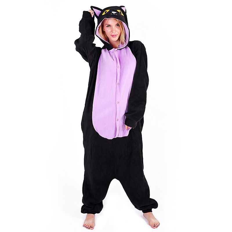 Highlights [Fabric] : Crafted from soft, plush flannel, this onesie provides exceptional warmth and comfort, making it a cozy choice for both lounge wear and sleepwear. The high-quality material ensures durability while maintaining a lightweight feel. [Fit] : Designed with a loose, relaxed fit, this onesie offers unrestricted movement, allowing you to stay comfortable whether you're lounging at home or sleeping. Its generous sizing accommodates a range of body types. [Design Highlights] : This playful onesie features a whimsical design inspired by beloved characters. The hood is adorned with charming cat ears and embroidered facial details, while the button-up front allows for easy dressing. The overall color scheme includes a combination of vibrant black, lavender, and accents of yellow, light green, and green, adding to its fun and unique appeal. [Occasions] : Perfect for carnival festivities, cosplay events, or simply adding a touch of fun to your nightwear collection. This character onesie is ideal for anyone looking to embrace their playful side while enjoying unmatched comfort. [Size Range] : Available in sizes S, M, L, and XL, this unisex onesie is suitable for adults of various sizes, offering a comfortable fit for everyone.