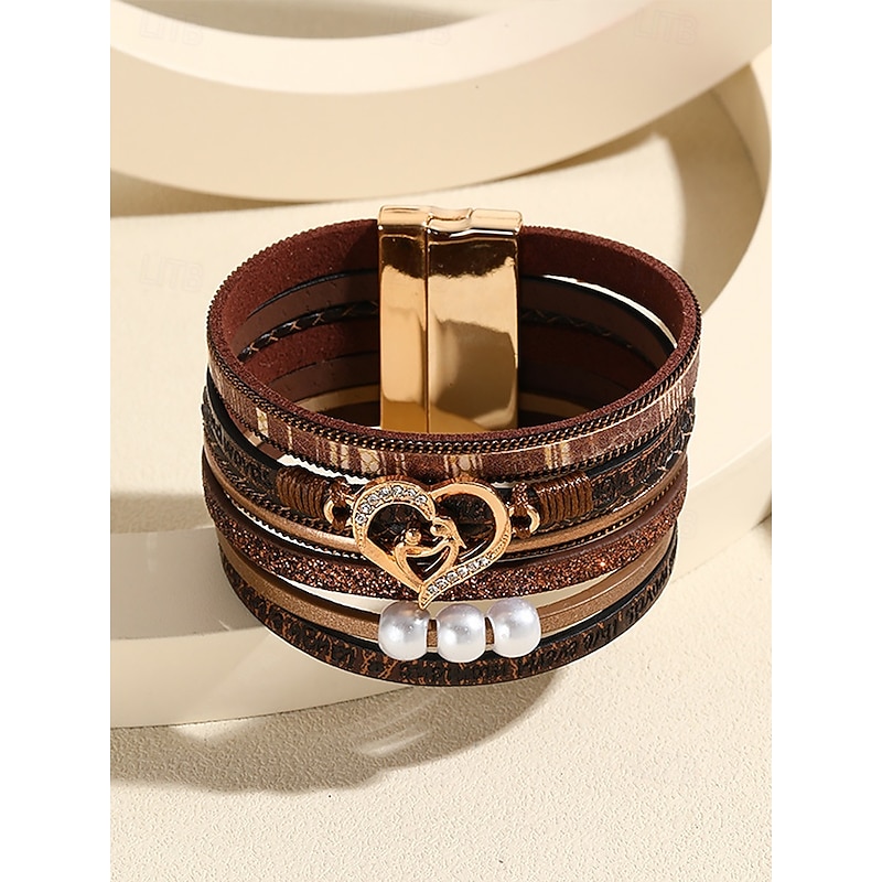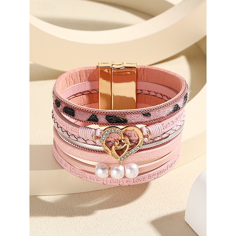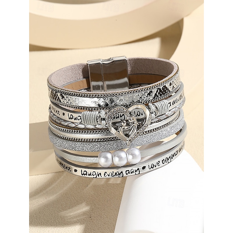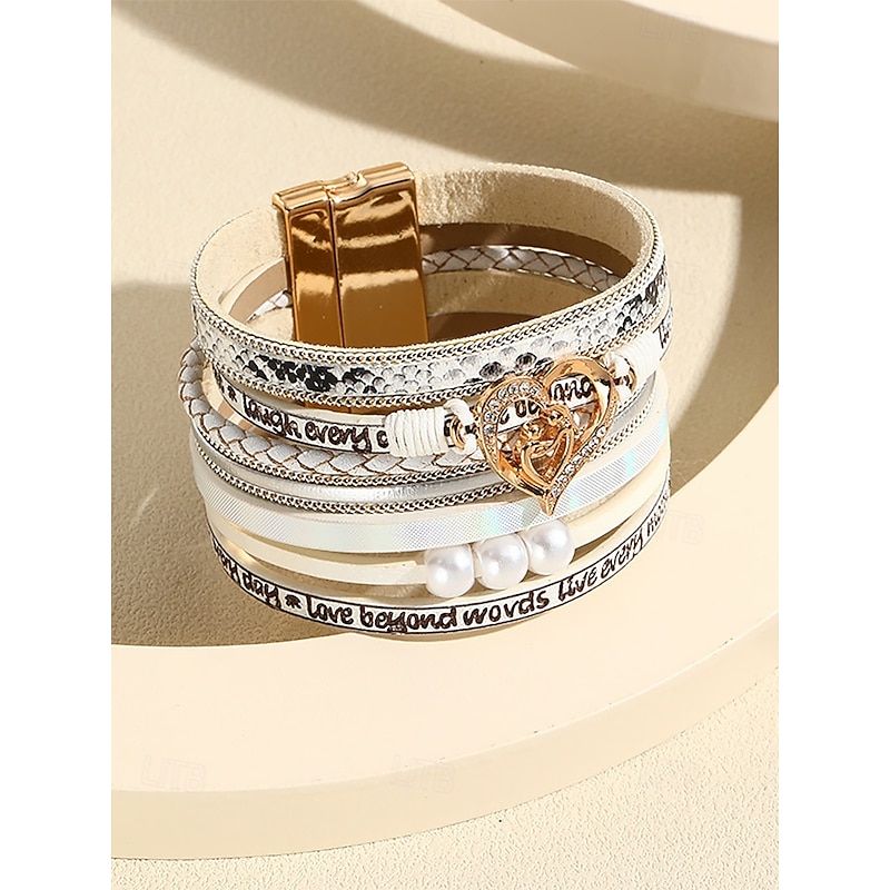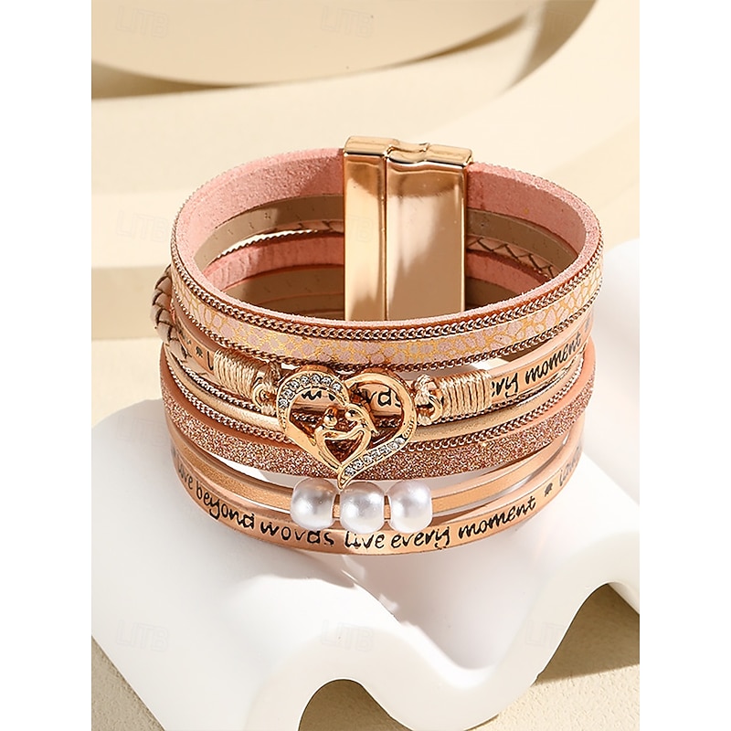 $11.99 - Women's Magnetic Faux Leather Bracelet – Heart & Pearl Charm Alloy Cuff with Inspirational Text, Boho Style Fashion Jewelry Gift for Mom, Suitable for Mother's Day, Birthdays and Casual Outfits 2025. Shop for cheap Women's Bracelet online? Buy at lightinthebox.com on sale today!