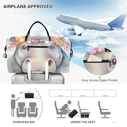 More information about Large Travel Duffel Bag, Yellow Floral Hippo Sport Tote Gym Bag, Shoulder Weekender Overnight Bag for Women Men, Carry On Luggage with Toiletry Bag