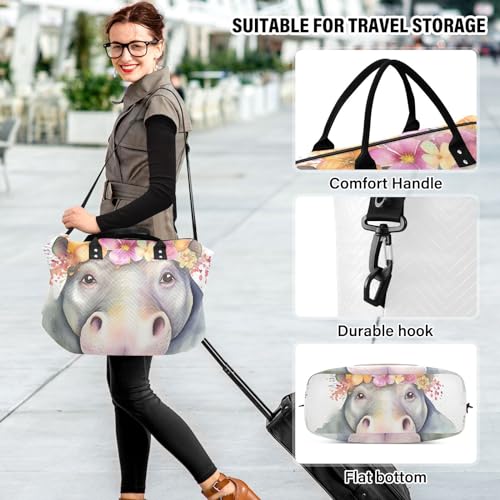 Large Travel Duffel Bag, Yellow Floral Hippo Sport Tote Gym Bag, Shoulder Weekender Overnight Bag for Women Men, Carry On Luggage with Toiletry Bag 7