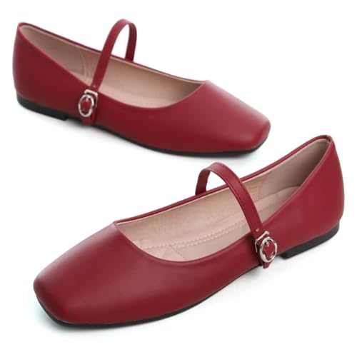 Stunner Ballet Flats for Women Women's Mary Jane Shoes Square Toe Casual Flats Comfortable Ankle Strap Flat Shoes Red 42(9) 2 5