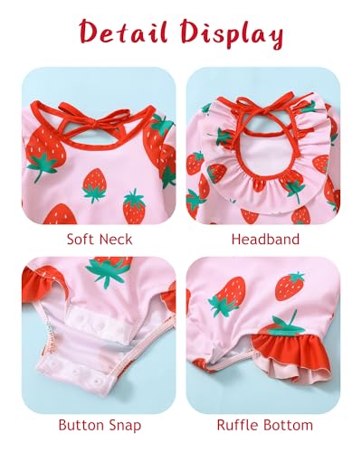 • Adorable Styles Bathing Suits: Baby girl swimsuits come in a variety of cute strawberry daisy flower sunflower printed, perfect for little ones. Durable button snaps +Safe and soft strap closur design+Pretty elastic hat is designed for 0-24 months baby girl.