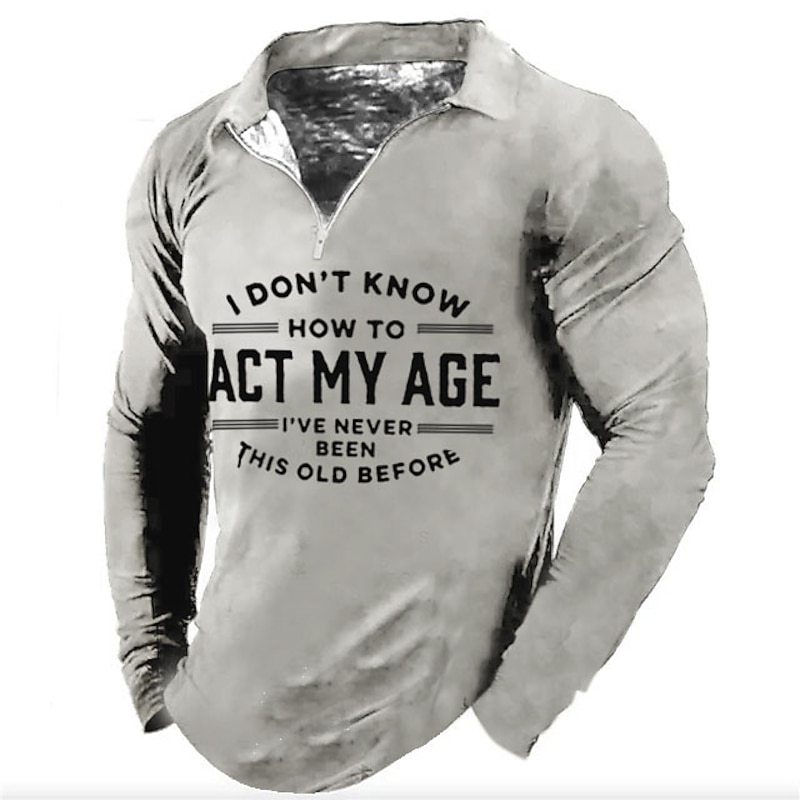 Highlights [Fabric]: Crafted from a soft and comfortable cotton blend, this men’s shirt ensures breathability and ease of wear for various occasions. [Fit]: Featuring a tailored yet snug fit, this long-sleeve polo shirt accentuates the physique while allowing freedom of movement, making it ideal for both casual outings and relaxed sports activities. [Design Highlights]: The shirt boasts a vintage and playful design with a stylish quarter-zip at the collar and a humorous 3D print graphic, “I don’t know how to act my age, I've never been this old before,” adding a touch of whimsy. The collared, zip-up style enhances versatility and comfort. [Occasions]: Perfect for streetwear, festivals, and party outfits, this shirt brings a casual yet chic vibe to any gathering, allowing you to stand out with its unique print and vintage charm. [Size Range]: Available in a wide range of sizes from S to 5XL, catering to diverse body types for an inclusive fit.