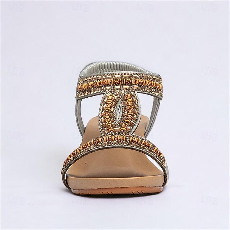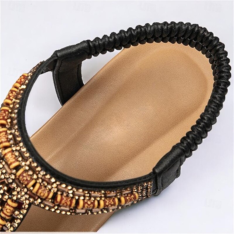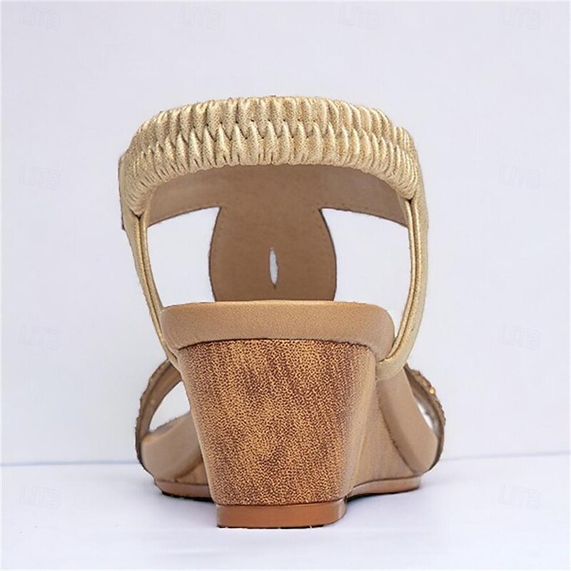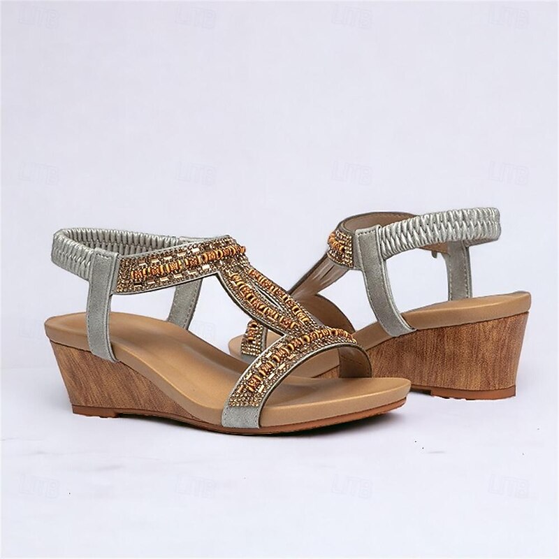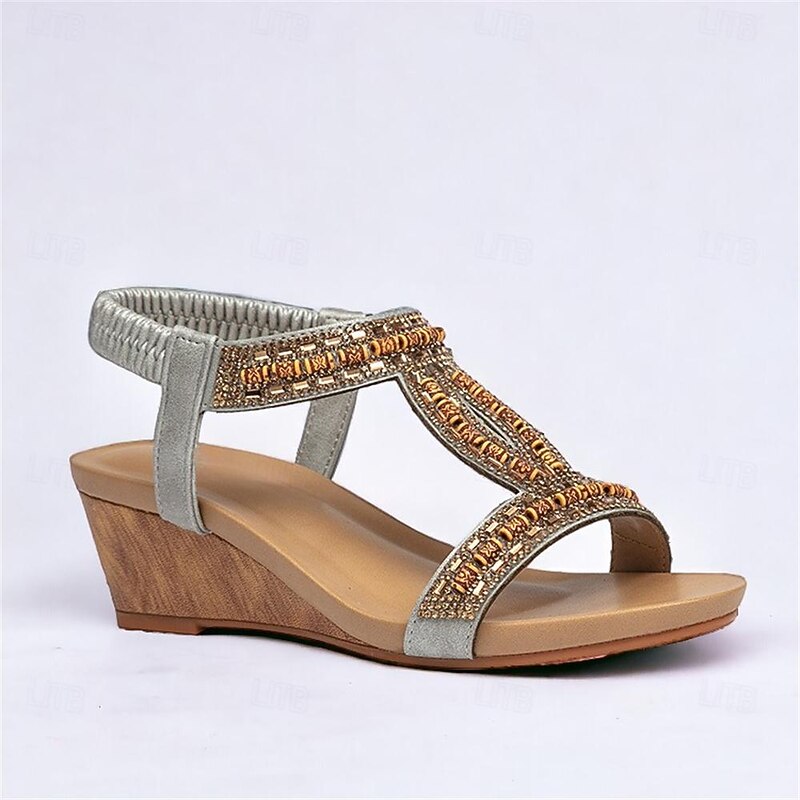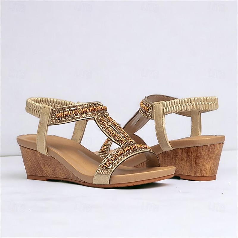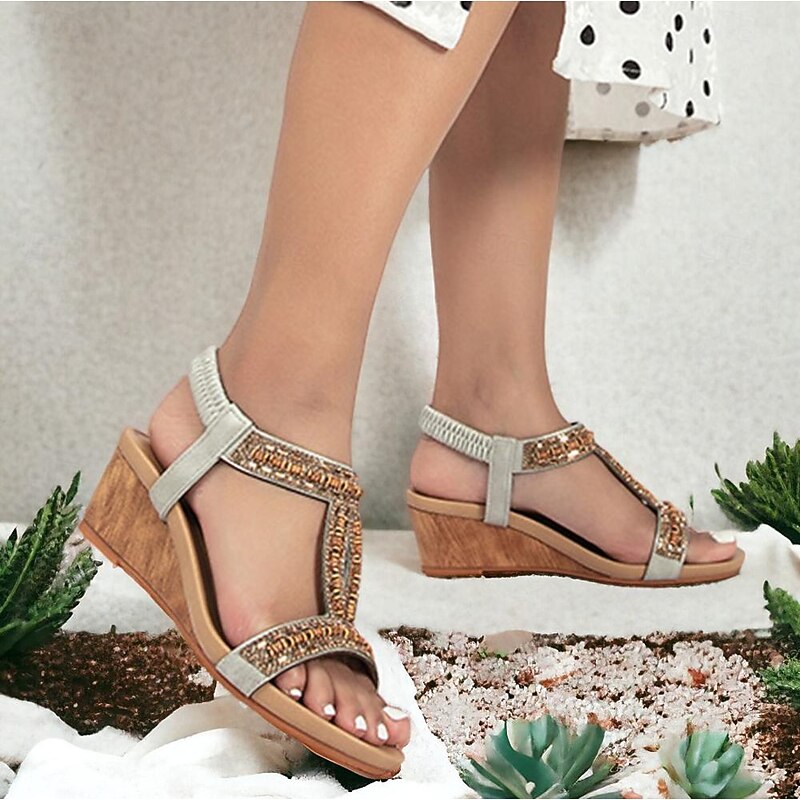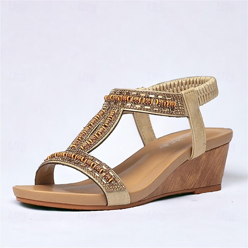 Highlights [Fabric] Crafted from high-quality PU material, these women’s sandals offer a comfortable and durable experience, ideal for everyday wear. The soft, flexible fabric straps ensure a secure and snug fit, accommodating your foot comfortably. [Silhouette] Featuring a sophisticated platform heel, these sandals provide a subtle lift while maintaining comfort. The open-toe design and wedge heel combine for a stylish appearance suitable for various occasions. [Design Highlights] These sandals are adorned with intricate rhinestone embellishments and detailed embroidery, exuding a bohemian charm. The adjustable buckle closure at the ankle ensures a perfect fit, complemented by an elegant lace-up style. [Occasions] Perfect for daily wear, office environments, beach outings, and casual or dressy events. Whether it's a day at work or a weekend beach getaway, these sandals bring both style and comfort to any occasion. [Size Range] Available in a range of sizes from US6 / EU36 / UK4 to US12 / EU42 / UK10, these sandals are designed to fit various foot sizes, providing options for a broad range of customers.