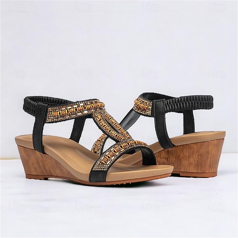 Women's Black Wedge Sandals with Rhinestone Embellishments and Elastic Strap – Stylish and Comfortable Summer Footwear 17