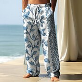 HOT ! Men's Trousers Baggy Pants Casual Pants Elastic Drawstring Waist Linen-Like Pants with Pockets Floral Print Flowers Full Length Outdoor Vacation Vacation White & Blue Light Khaki Inelastic