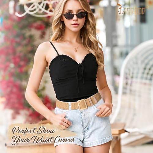 HOT ! JASGOOD Straw Woven Elastic Belt for Women Wide Stretchy Rattan Waistband for Dress Boho Braided Belt with Gold Buckle