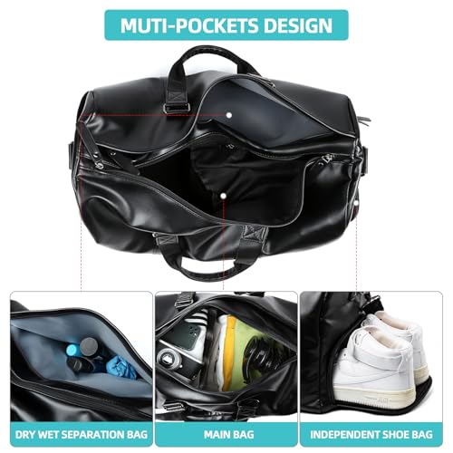 Leather Duffle Travel Gym Bag for Men with Shoe Compartment, 32L PU Leather Weekender Waterproof Overnight Bag Gym Sports Carry-On Black 6