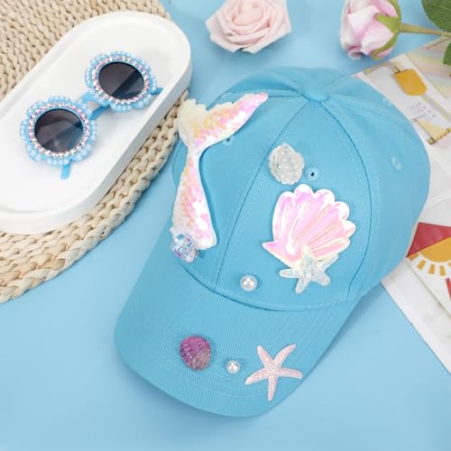 Girls Baseball Cap Sunglasses for Kids, Mermaid Baseball Hat Adjustable Summer Sun Hat Rhinestone Pearl Sunglasses Casual Trucker Cap for Girls 5-12 Years 6