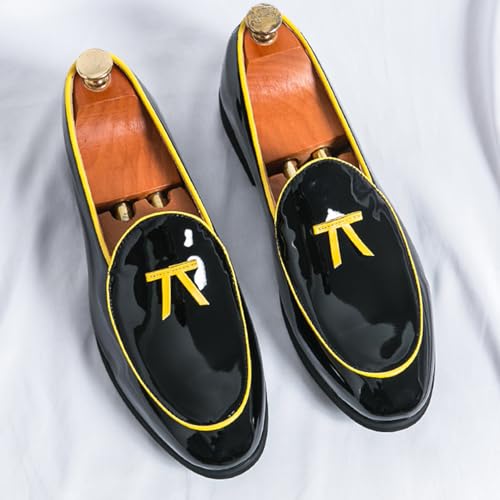 Men's Penny Loafers Patent Leather Loafers Slip-On Dress Shoes Black with Yellow Trim Formal Moccasins 7