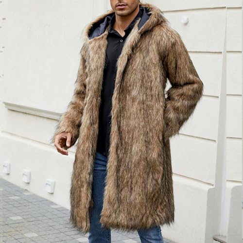 HOT ! Men's Faux Fur Coat Hooded Cardigan Jacket Winter Warm Long Coats Fuzzy Open Front Overcoat Outwear with Pockets