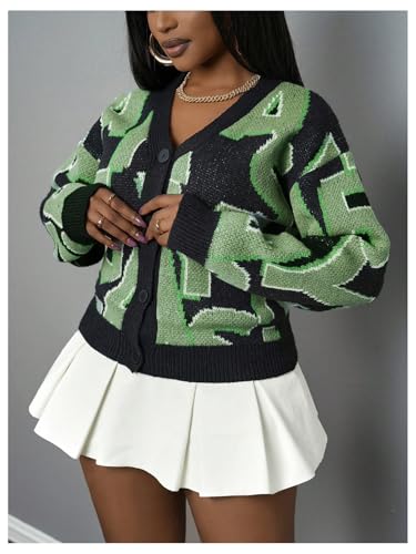 Women's Graphic Cardigan Sweaters Letter Print Button Down Long Sleeve V Neck Knit Outerwear 5