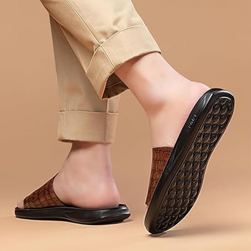 Men's Printed Leather Sandals - Open-Toe Anti-Slip Flat Design Outdoor Casual Beach Summer Shoes 6