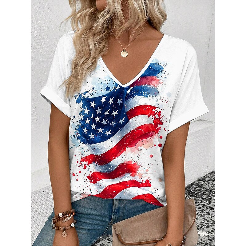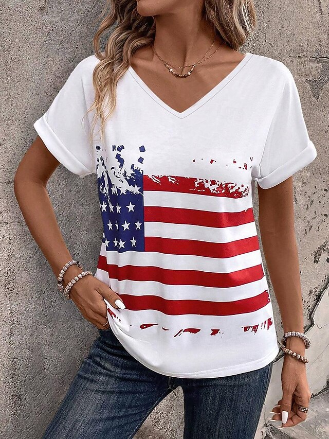 Highlights [Fabric:] Expertly crafted from a lightweight blend of polyester, this women's T-shirt ensures breathability and softness, ideal for keeping you comfortable during the warm summer months. The micro-elasticity of the fabric offers gentle stretch for ease of movement, making it perfect for daily wear. [Fit:] This T-shirt features a relaxed fit, providing a cozy and laid-back feel that is perfect for vacation or casual outings. Its regular top length and V-neckline combine elegance with everyday style, making it versatile to pair with jeans, shorts, or skirts. [Design Highlights:] Adorned with a bold American flag print, this T-shirt boasts a patriotic and eye-catching look, perfect for showcasing your style during Independence Day and other celebratory events. The short sleeves are slightly rolled up, adding a trendy touch to its overall appearance. [Occasions:] Ideal for both daily wear and vacation outings, this T-shirt is a stylish choice for enjoying warm summer days. It's the perfect companion for festive gatherings, laid-back weekends, or any casual adventure. [Size Range:] Available in a versatile range of sizes from S to 2XL, this T-shirt ensures a comfortable fit for various body types, offering style and comfort for every woman seeking a fashionable summer staple.