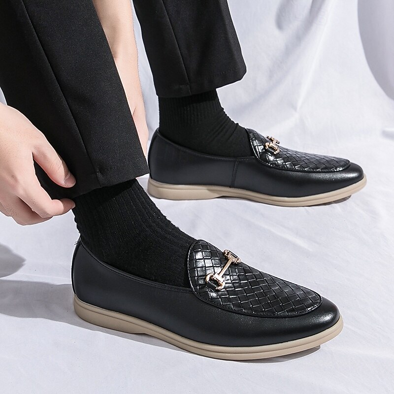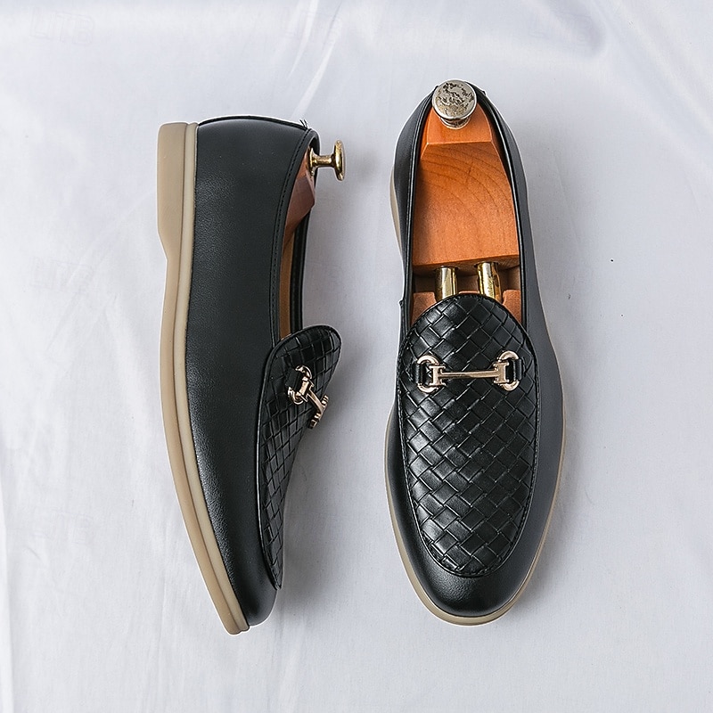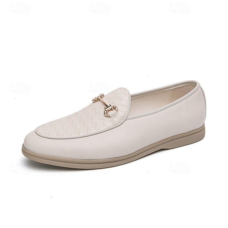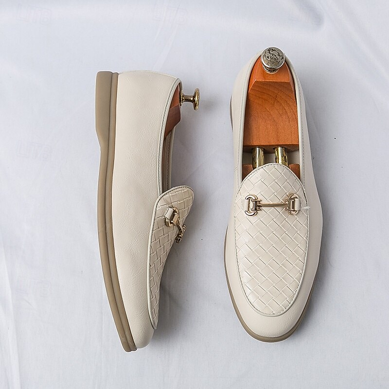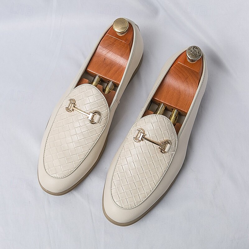 HOT ! Men's White Faux Leather Slip-On Loafers with Woven Detail and Gold Buckle – Elegant Casual Shoes for Work and Formal Occasions