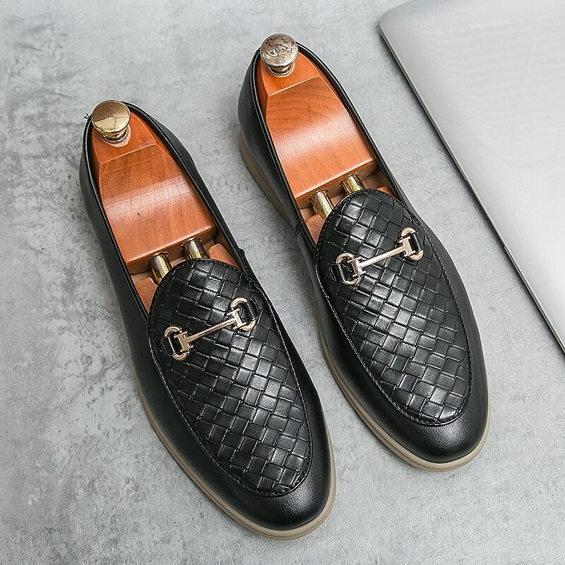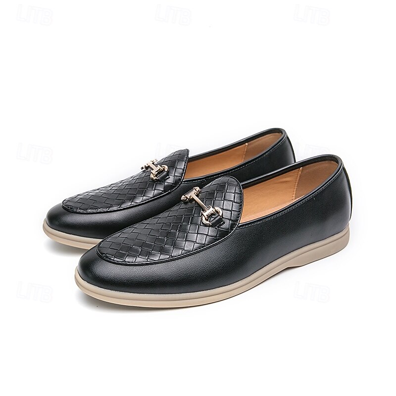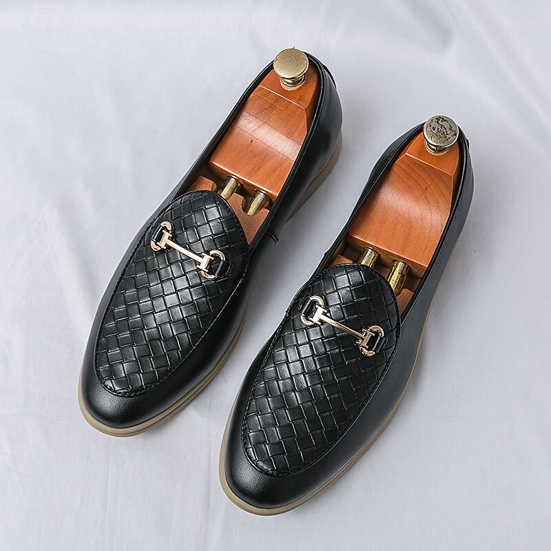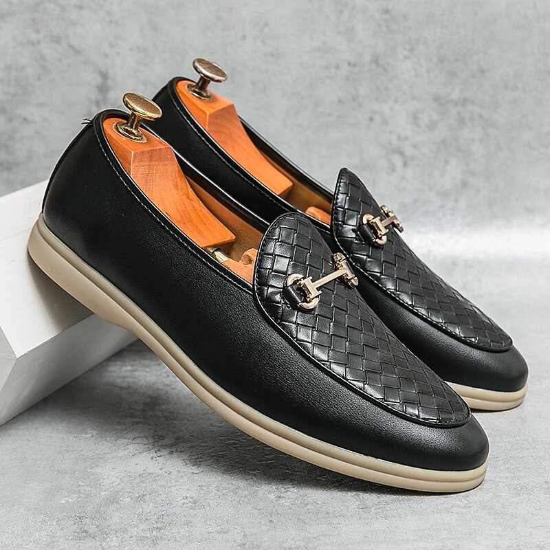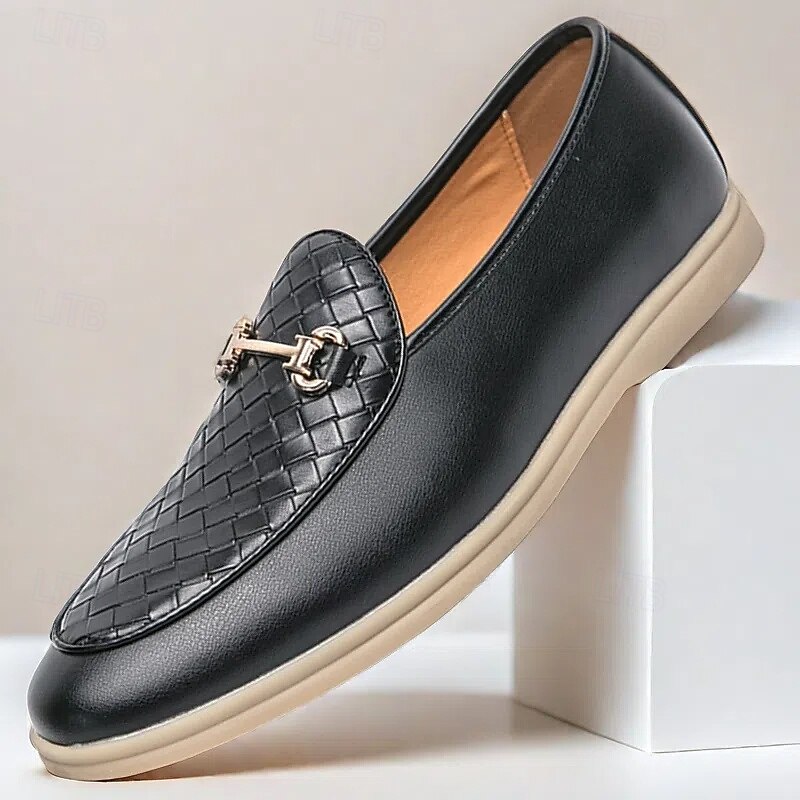 HOT ! Men's White Faux Leather Slip-On Loafers with Woven Detail and Gold Buckle – Elegant Casual Shoes for Work and Formal Occasions