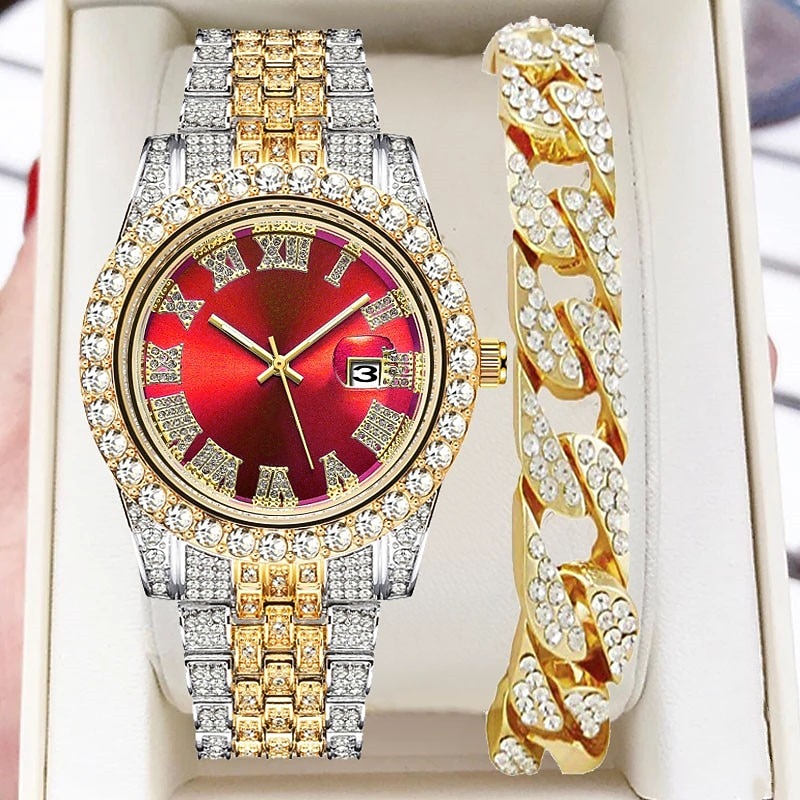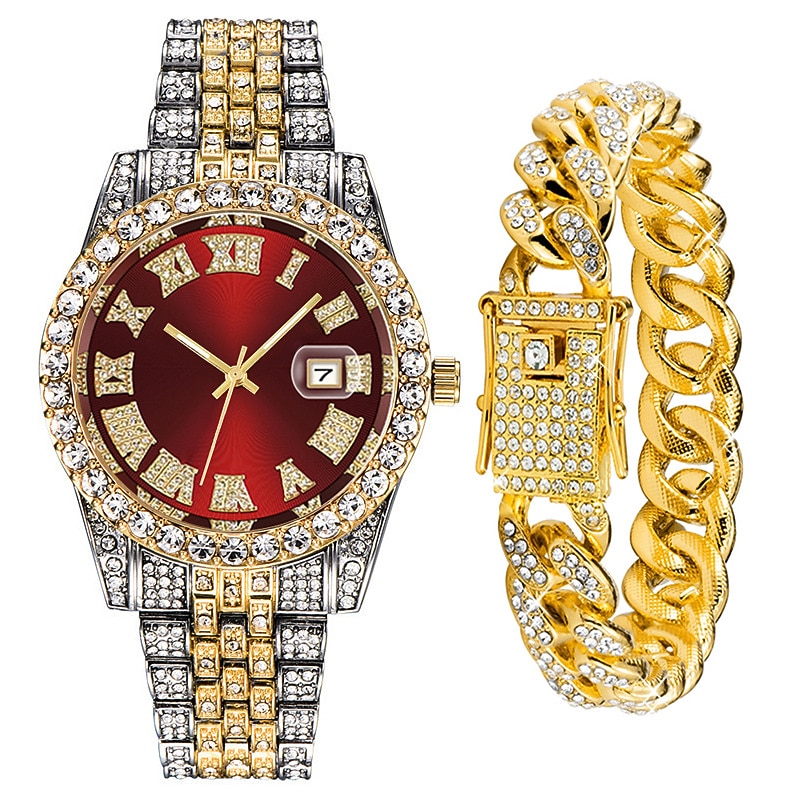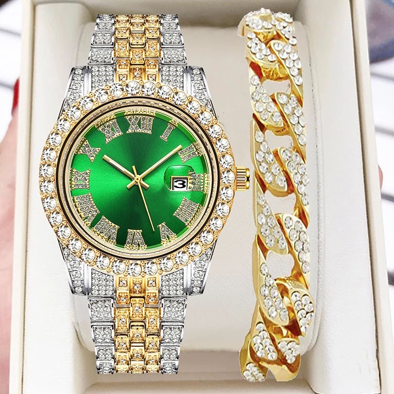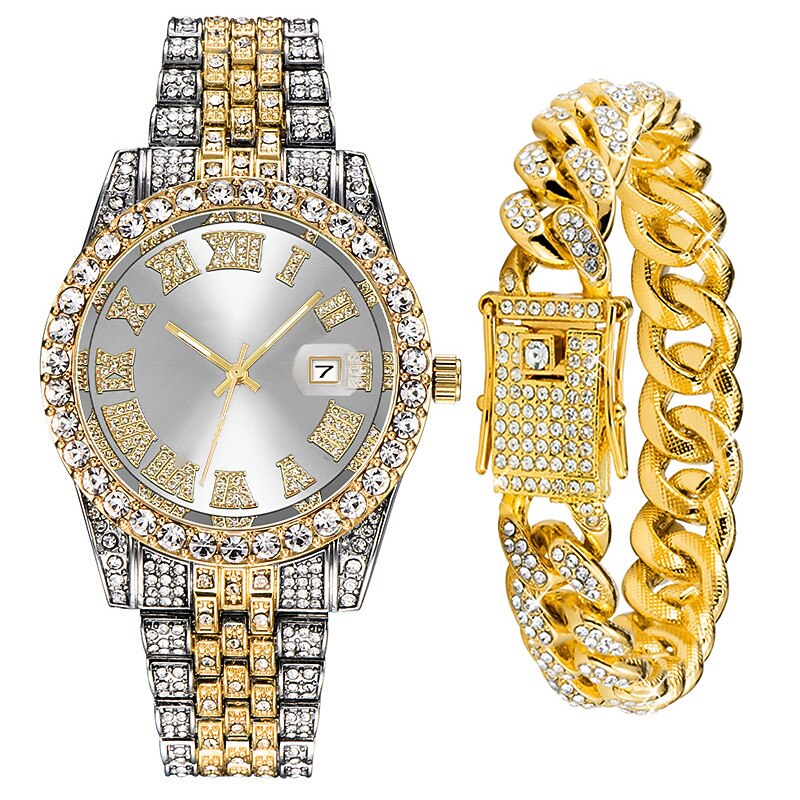 HOT ! Men's Quartz Watch with Chain Bracelet Set Fashion Luxury Bling Diamond Hiphop Analog Men Quartz Wristwatch Calendar Waterproof Men's Watch