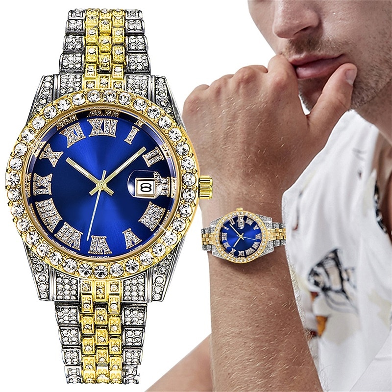 Men's Quartz Watch with Chain Bracelet Set Fashion Luxury Bling Diamond Hiphop Analog Men Quartz Wristwatch Calendar Waterproof Men's Watch 13