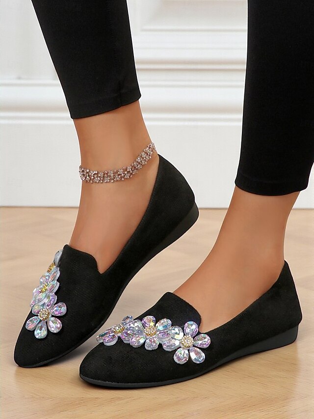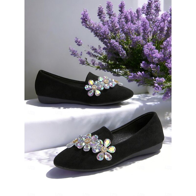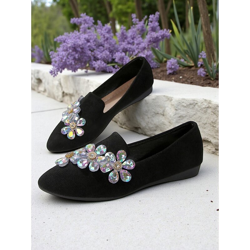 Women's Black Faux Suede Slip-on Shoes with Rhinestone Flower Embellishment – Elegant Comfort Shoes for Parties and Daily Wear