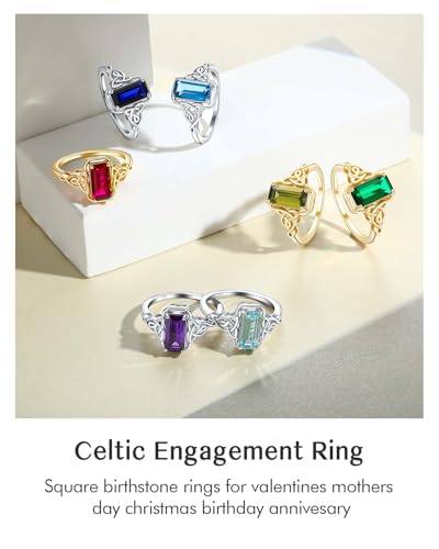 More information about DAYBYDAY Celtic Birthstone Rings for Women, 925 Sterling Silver/18K Gold Plated Emerald Cut Celtic Knot Engagement Wedding Ring, Square Created Gemstone Promise Rings for Her Size 6-10