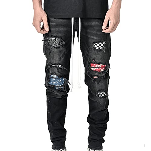 HOT ! Generic Men's Vintage Ripped Patch Jeans Printed Pattern Skinny Biker Denim Pants Hip Hop Skinny Check Patchwork Jean Trousers (Black,Small)